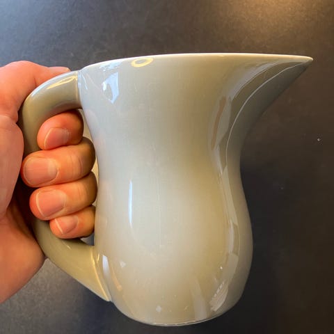 Kanden har et organisk, buet design med markant hældetud og solid hank.