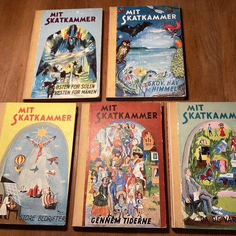 Mit Skatkammer børnebøger samling. Serien indeholder flere bind med eventyr, historier og rim for børn, bl.a. titlerne "Fortæl mor", "Der var engang", "Verden er så stor" og "Østen for solen". Bøgerne er illustrerede med farverige forsider og sort-hvide tegninger inde i bøgerne. Teksten er på dansk og henvender sig til børn i højtlæsning eller selvlæsning afhængigt af læseniveau. Velegnet som klassisk børnelitteratur og oplæsningsbøger i hjemmet eller institutioner.