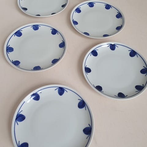 Lyngby tallerkener i hvid porcelæn med blå bølgede linjer som dekoration. Tallerkenerne egner sig til fx dessert, kage eller mindre serveringer. Klassisk Royal Copenhagen stempel under bunden. Antal, mål og eventuelle stelnavne kan angives af sælger i annoncen, hvis kendt.