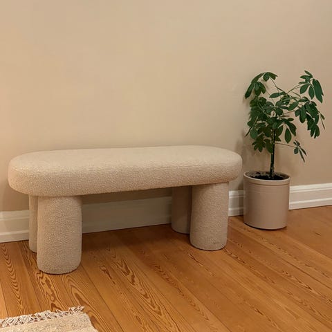 Sofacompany bænk i rosa stof med sorte metalben. Polstret sæde med afrundede hjørner og slankt stel. Velegnet som siddeplads i entré, stue eller soveværelse samt som ekstra afsætningsplads.