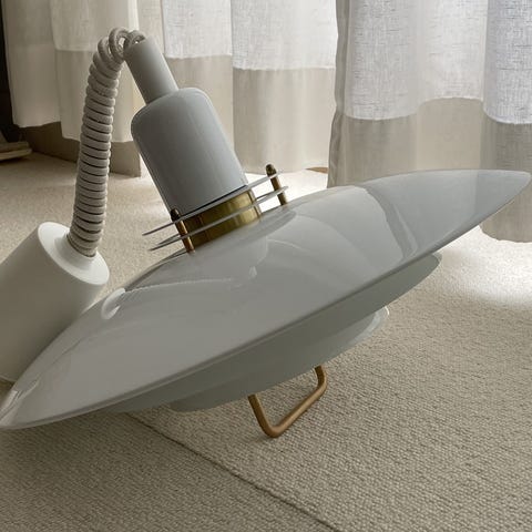 En Belid Picasso pendel lampe i hvid. Ø50.Designet af Joakim Fihn. Lampen har et flerlags skærmdesign, der giver et nedadrettet og blændfrit lys velegnet til ophæng over spisebord, sofabord eller i stue. Ophængt i ledning fra loftet med baldakin (ikke synlig på billederne). Velegnet til indendørs belysning i boligmiljøer.
