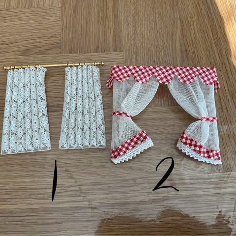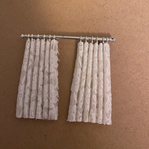 Lundby gardiner til dukkehus vindue i hvidt stof med fastgjorte gardinholdere. Gardinerne er monteret på en lys plastikkarm, som kan sættes i et dukkehusvindue. Egnet som tilbehør til Lundby dukkehus og lignende dukkehuse i samme skala.sælges plus evt porto
