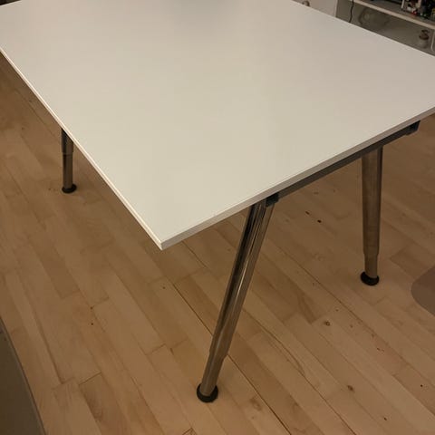 Hvidt Ikea skrivebord med justerbare ben.