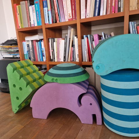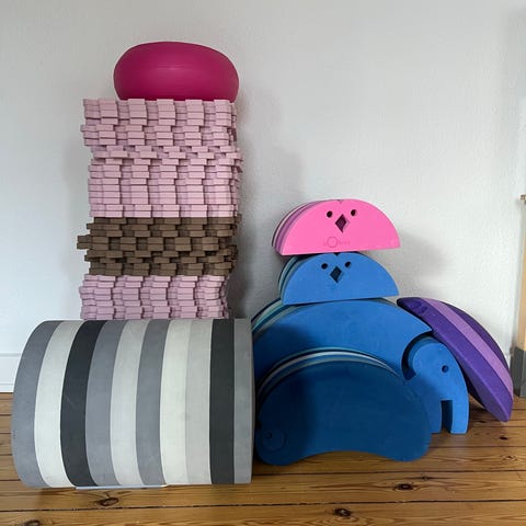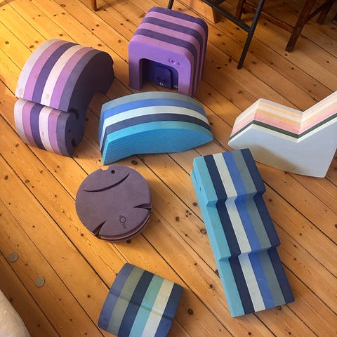 Bobles tumlemøbler sæt i skum. Sættet består af flere trædesten i forskellige farver samt et større vippebræt i grøn. Elementerne er fremstillet i fast skum, der er egnet til leg og motorisk træning indendørs for børn. Kan bruges enkeltvis eller samlet til balancelege og andre motoriske aktiviteter på gulv.