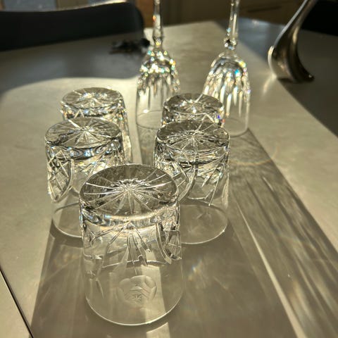 Har facetslebet mønster i kuppen og er fremstillet i farvet grønt glas, der er lidt forskellig fra glas til glas.