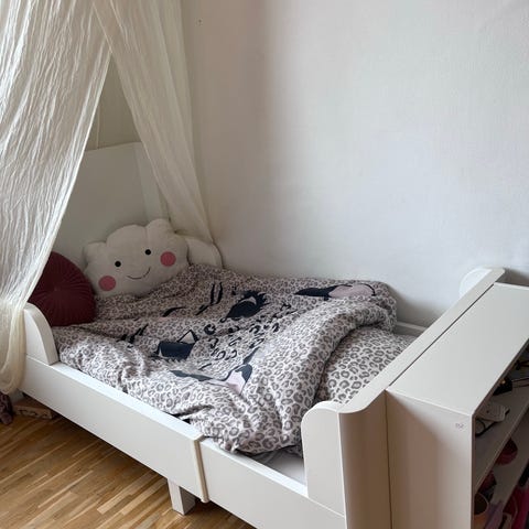 IKEA juniorseng i hvid. Sengen er velegnet til mindre børn, som overgang mellem tremmeseng og almindelig seng. Der er sengehest på siden for ekstra sikkerhed. Under sengen er der plads til opbevaring i kasser eller kurve. Passer til standard junior-madrasstørrelse.