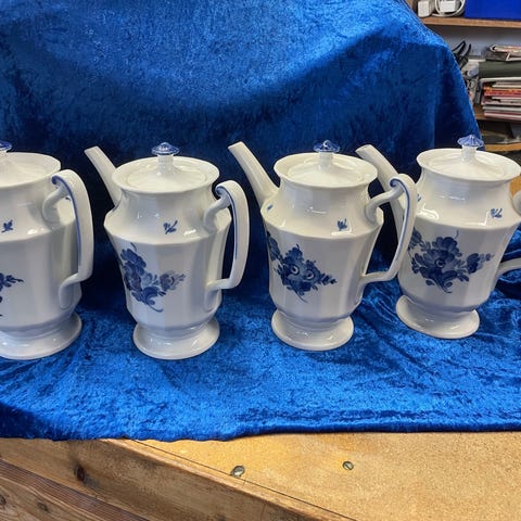 Samling royal copenhagen porcelæn blå blomst kantet, 5 par tekopper og 8 par kaffekopper, kaffekande, fade, lysestager, sukker og fløde mm. alt er uden skår.