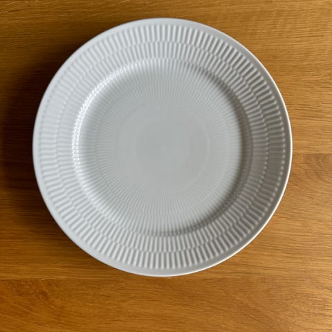 8 stk Royal Copenhagen dyb tallerken i hvidt porcelæn 21 cm i diameter. Tallerkenen har rillet mønster langs kanten og klassisk Royal Copenhagen stempel på undersiden.