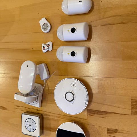 Alarmsystem med kontrolpanel, flere bevægelsessensorer, dør- og vinduessensorer samt fjernbetjening. Systemet omfatter et hovedpanel med display og betjeningsknapper, flere trådløse sensorer til overvågning af rum samt magnetkontakter til montering på døre og vinduer. Der medfølger desuden små komponenter.
