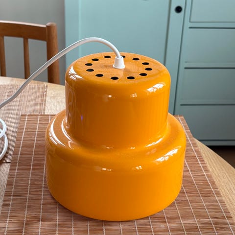 Jo Hammerborg “Sektor” pendel af rødlarkeret metal. Højde 21,5cm.Dia 14,5cm. Rustpletter og afskalninger.