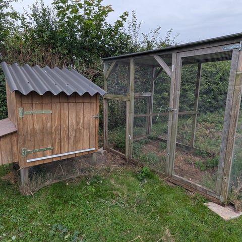 Sælger hjemmelavet mobilt hønsehus bygget på trailer, så det nemt kan flyttes rundt.