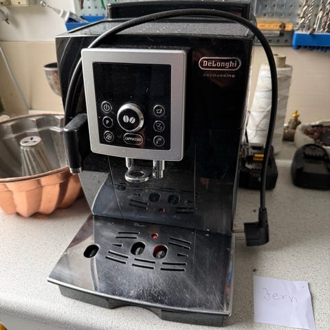De'Longhi Eletta Cappuccino Top espressomaskine i sort med integreret mælkebeholder. Maskinen har frontbetjening med knapper til forskellige kaffedrikke og justerbar kaffetud. Der medfølger aftagelig mælkebeholder samt ekstra beholder. Egnet til tilberedning af espresso, kaffe og mælkebaserede drikke i hjemmet. Maskinen har drypbakke og kopholder på toppen.