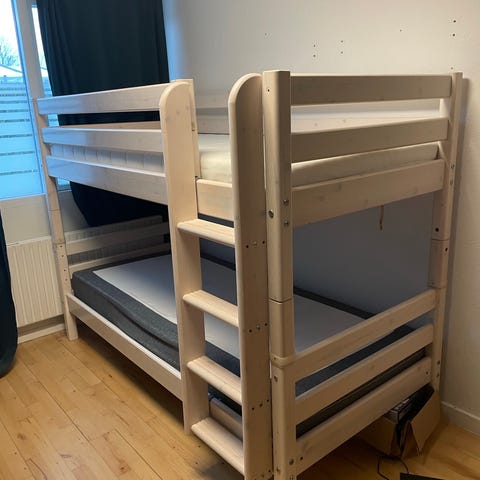 Flexa køjeseng til børn i hvidt træ. Sengen består af to senge placeret over hinanden med fastmonteret stige i den ene ende. Egnet til børneværelse, hvor der er behov for to sovepladser på begrænset plads. 3 tilhørende bedrollers medfølger. Madrasser medfølger hvis de ønskes.