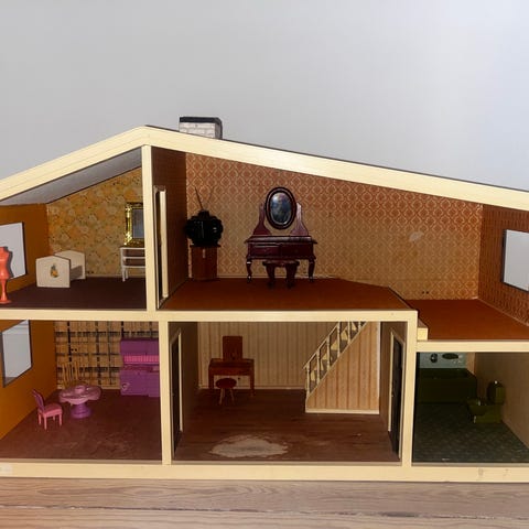 Meget charmerende retro Lundby dukkehus i tre etager med garage og bil. Huset er fyldt med fine gamle møbler, nogle lamper, andre ting og skovens dyr. Der er bl.a. badevætelse med badekar, brusekabine, toilet, håndvask, spand og vægt. Der er også et gammelt TV, radio, juletræ og et fantastisk akvarie til lys. Der medfølger et stk strømforsyning, der virker til nederste etage. Huset måler ca. 70 i bredden, 60 i højden og 27 cm i dybden. Det koster 1200 kr og prisen er fast.