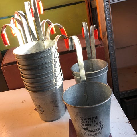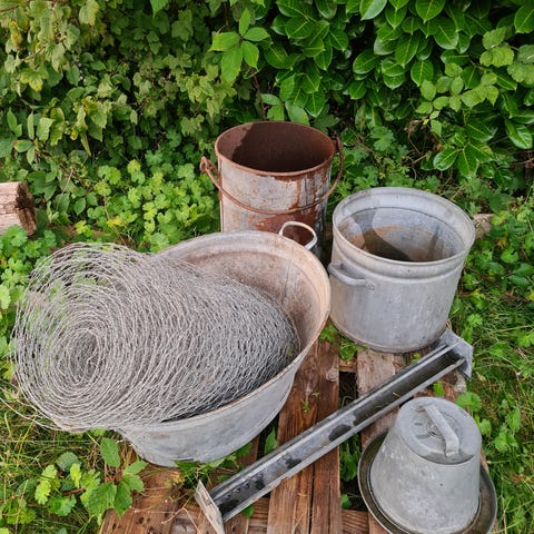 Galvaniseret metalspand med hank. Spanden er udført i galvaniseret metal med patineret overflade og har to små øjer i siderne til bærehank. Der er orange tryk/tekst på den ene side. Egnet til opbevaring, havebrug eller som dekorativ genstand i fx værksted, garage eller have.