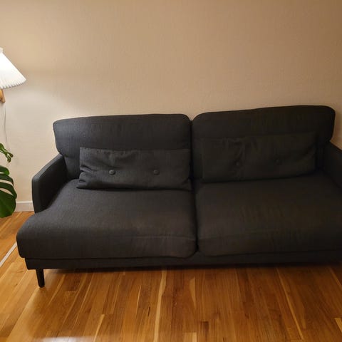Grå 3-personers sofa, som ikke fylder så meget. Sæde og ryg er i et stykke, så siddekomforten er god.