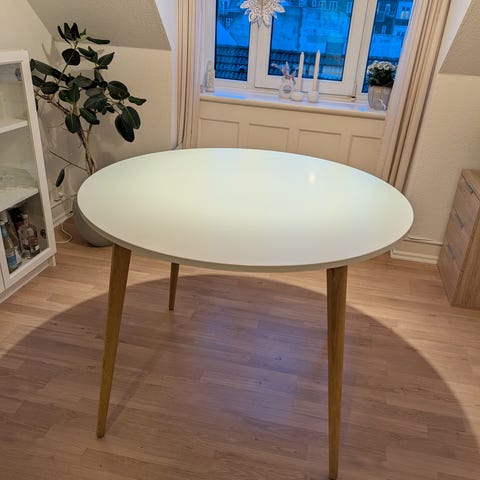 Rundt spisebord. 115 cm i diameter. Indbygget tillægsplade på 50 cm.