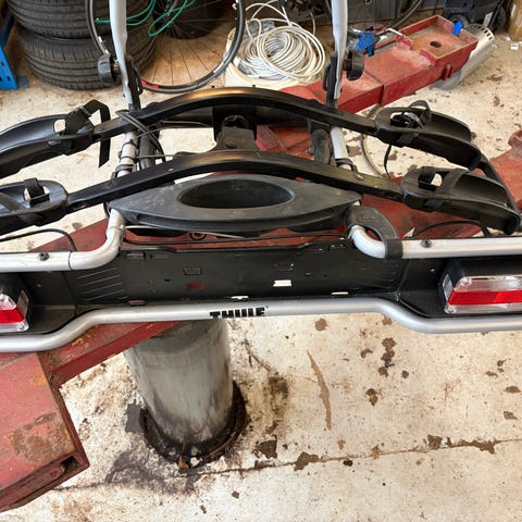 Super flot Thule cykelholder med vippe funktion til montering på anhængertræk. Holderen er beregnet til transport af cykler bag på bilen og har integreret lygtebom og plads til nummerplade. Konstruktionen er i metal og plast med justerbare arme og remme til fastgørelse af cyklerne. Velegnet til personbil med anhængertræk, hvor der er behov for sikker transport af cykler på længere eller kortere ture.