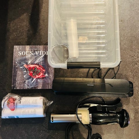 EPIQ sous vide cooker og vakuum food sealer køkkensæt. Sættet består af en sous vide cooker med digitalt display og en separat vakuumpakker til forsegling af poser. Sous vide cookeren er velegnet til præcis temperaturtilberedning af kød, fisk, grøntsager og andre råvarer i vandbad. Vakuum food sealeren bruges til at pakke maden lufttæt i poser, hvilket kan være praktisk til både sous vide-tilberedning og opbevaring af fødevarer.