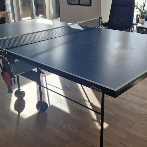 Stort set ubrugt, sammenklappeligt bordtennisbord med blå plade - nypris ca. 3500. Bat kan medfølge