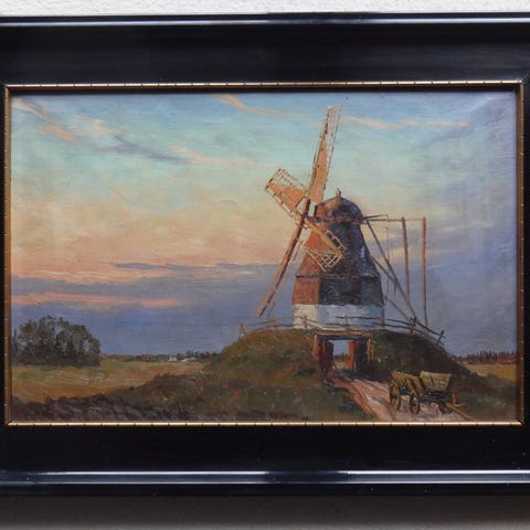 Maleri landskab i olie på lærred med motiv af skov og sø. Billedet er indrammet i en profileret, gylden træramme. De samlede mål med ramme er ca. 134 x 105 cm. Nederst på maleriet ses en signatur med initialer og årstal.