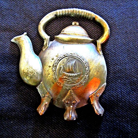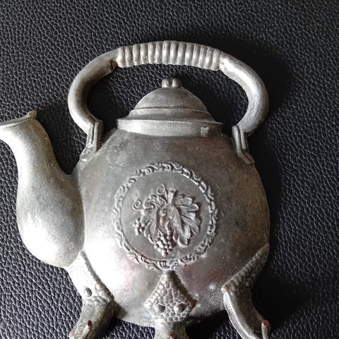 Vintage tekande / tepotte knage, Der er her tale om en unik vintage knage i kobber og jern, designet som stor tekande / tepotte. Flot patina.
