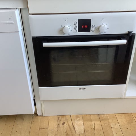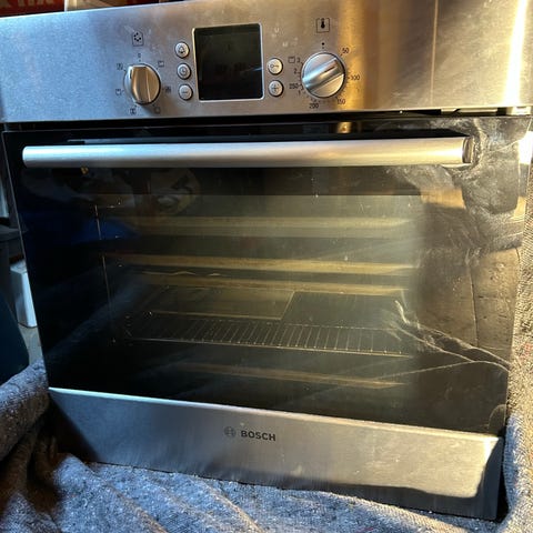 Bosch indbygningsovn med varmluft. Ovnen er udført i sort front med glaslåge og håndtag i metal. Indvendigt er der rist og bageplader samt varmluftsblæser bagtil. Velegnet som indbygningsovn i køkkenmodul til almindelig madlavning og bagning med varmluftsfunktion.