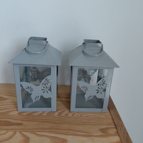 lanterner i metal i beige farve. Lanternerne har udskårne dekorative mønstre i siderne og klar indsats, så lyset kan skinne igennem. Øverst er der håndtag/ring, så de kan hænges op eller flyttes nemt. Indvendigt er der en holder til fyrfadslys. Velegnet som indendørs dekoration eller til overdækkede udendørs områder, hvor der ønskes levende lys i fyrfadsstørrelse.