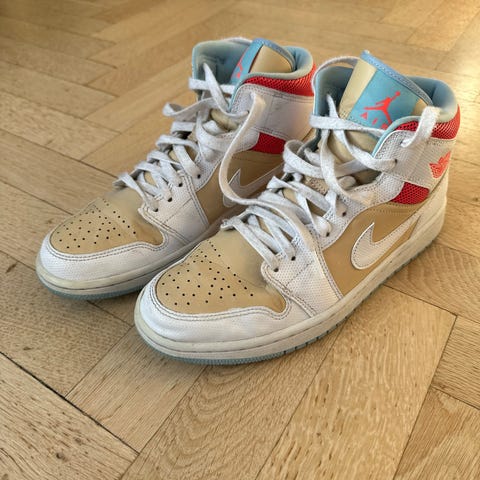 Nike Air Jordan 1 Mid basketballsko i størrelse 41. Skoene er overvejende hvide med gule detaljer, herunder gul Nike Swoosh og gul ydersål. Sæt et par nye snørebånd i og de ser ud som nye. Fra røg og dyrefrit hjem. Kan sende på købers regning.
