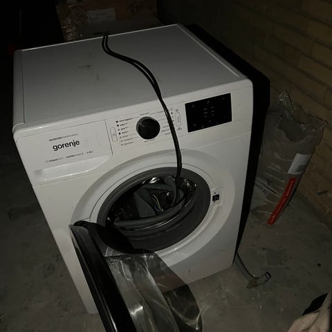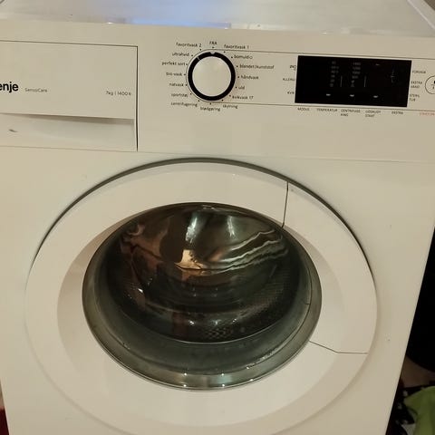 Gorenje frontbetjent vaskemaskine med tromle i rustfrit stål. Maskinen er hvid og har en rund frontlåge med glas. Kapacitet på 7 kg.