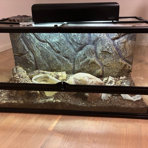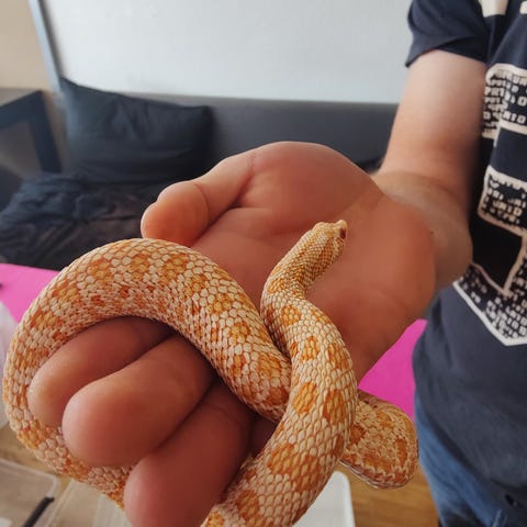 Fodres med små mus. Spiser fint og skifter ham fint.
