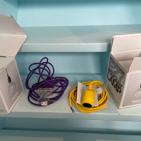 Den ene er helt ny og er stadig i kasse, den anden har været hængt op, men fejler intet. 2 ekstra pærer medfølger. Nypris pr. stk: 650kr.