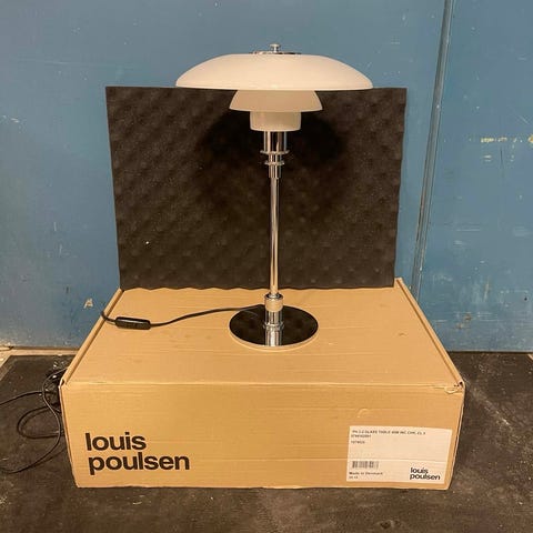 Louis Poulsen PH bordlampe designet af Poul Henningsen. Klassisk tre-skærms lampe med hvide glasskærme og stel i forkromet metal. Lampen har en højde på ca. 47 cm, skærmdiameter på ca. 29 cm og foddiameter på ca. 15,5 cm. Velegnet som bord- eller skrivebordslampe i stue, soveværelse eller kontor.