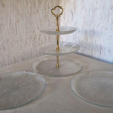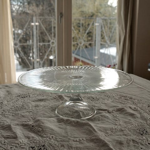 Smuk kageopsats i glas med blomstermotiver sælges.