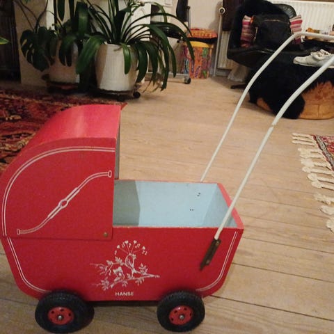 Dukkevogn i flet med træhjul. Trænger til en kærlig hånd