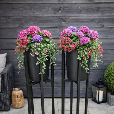 Jern plantebord med dekorativt mønster i kanten og fire slanke ben forbundet med stivere nederst. Bordet er egnet som plantebord eller lille piedestal til udendørs eller indendørs brug, afhængigt af behov. Overfladen fremstår med patina og rustpræg, som giver et råt, industrielt udtryk.