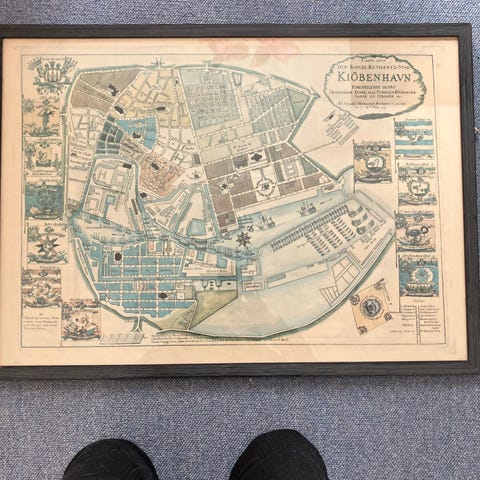 København Hafnia vægkort med træramme. Kortet viser et historisk bykort over København med volde, gader og havneområde. Motivet er trykt i afdæmpede farver med dekorative detaljer som kompasrose og byvåben. Kortet er indrammet i en enkel træramme med glas og er egnet til ophængning på væg i stue, kontor eller gang.