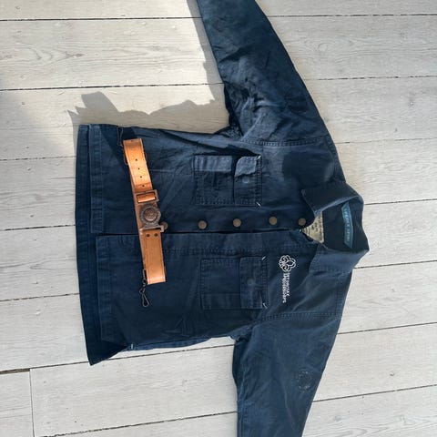 DDS spejderuniform bestående af grøn spejderskjorte og grøn fleecejakke samt rødt spejdertørklæde. Skjorten har knaplukning og lynlås foran, brystlommer og påsyede spejdermærker. Fleecejakken har gennemgående lynlås foran og lynlåslommer i siderne. Sættet er i go stand. Fleecen er aldrig brugt. Der er dog et lille gult mærke (måske maling) på ærmet. Det er afbilledet på sidste billede.