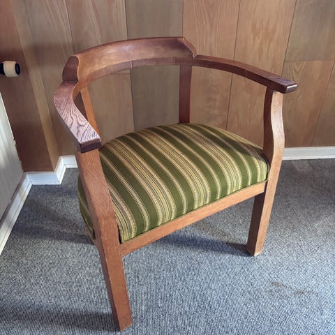 Solid klassisk stol af massiv eg. Til skrivebordet eller som lænestol. Kan evt. efterspændes. Siddehøjde 42 cm