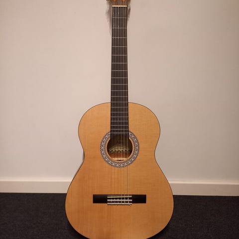 Brugt venstrehånds-guitar. Passer til børn fra ca. 6 til 9 år – eller som rejseguitar til voksne. Inkluderer transporttaske