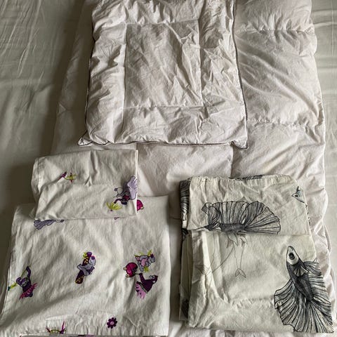 Jysk Ringsted Dun Royal juniordyne og pude i hvid. Dynen er en juniormodel fra serien Royal Junior dyne fra Ringsted Dun, forhandlet af Jysk. Sættet består af en juniordyne og en pude i lys/hvid farve. Fyldet er dun/fjer (jf. mærkatet), og yderstoffet er et glat tekstil. Velegnet til juniorseng eller barneseng. Yderligere mål og vægt fremgår af mærkatet på produktet.