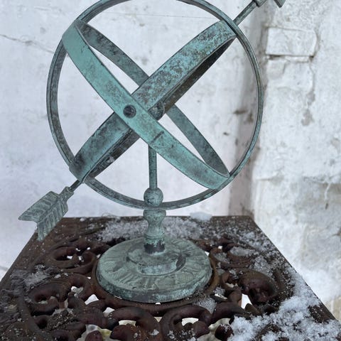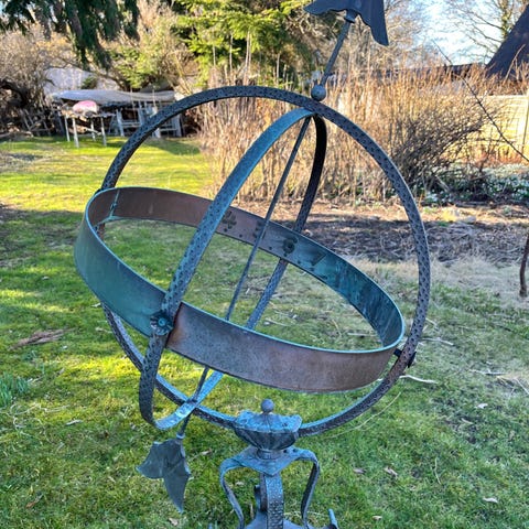 Armillariesfære / solur på figurfod i metal til have eller terrasse