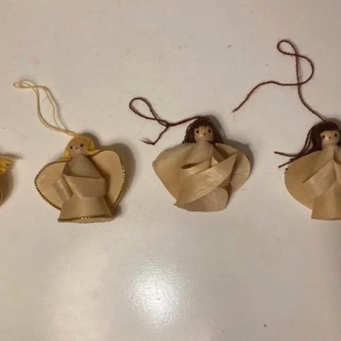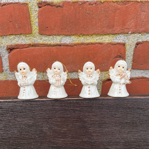 Sæt af seks gyldne englefigurer (keruber) fra 1970'erne, der ofte bruges som juletræspynt eller vægdekorationer. Disse vintage-figurer er fremstillet af plastik med en guld-farvet overflade. De er 7-8 cm høje og lige til at hænge op.