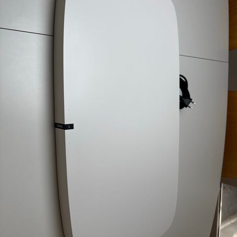 Sonos Playbar soundbar i sort. Soundbaren er beregnet til brug sammen med tv og kan tilsluttes via optisk indgang. På bagsiden er der netværksporte til kablet forbindelse til hjemmenetværk og andre Sonos-enheder. Enheden kan indgå i et Sonos multiroom-setup og bruges til både tv-lyd og musikafspilning. Strømkabel medfølger som vist på billederne.