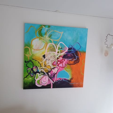 Abstrakt maleri på to separate lærreder. Motivet består af geometriske og organiske former i varme farvetoner som rød, brun, guld og beige. Billederne er rektangulære og hænger side om side som et samlet motiv. Velegnet som vægdekoration i stue, gang eller kontor, hvor man ønsker et moderne, abstrakt udtryk.