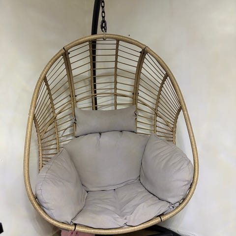 Hængestol med stativ i sort metal og flettet kurv. Stolen er udformet som en æggeformet kurv, der hænger i kæde og fjeder fra stativet. Medfølgende grå hynde giver siddekomfort. Egnet til brug indendørs eller i overdækkede udendørsområder, hvor der er plads til stativets runde fod og fri højde til ophængning af stolen.