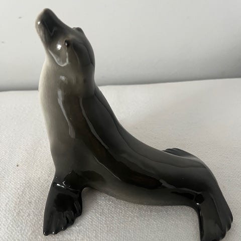 Søløve figur i grå nuancer. Dekorativ dyrefigur velegnet som pyntegenstand i stue, på hylde eller i vitrineskab. Figuren forestiller en siddende søløve med løftet hoved og detaljerede finner og hale.