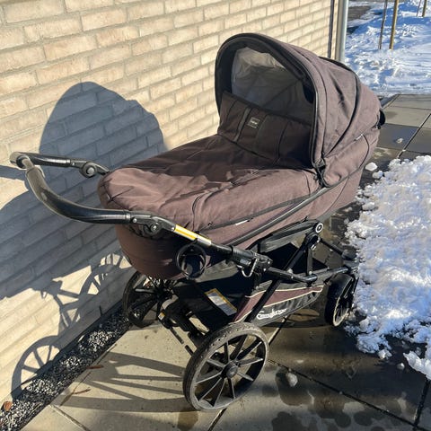 Fin barnevogn fra Emmaljunger, med punkterfrie dæk, indbygget myggenet, indbygget solsejl og thermobase ventilation system. Der med følger barnevongssele og regnslag. Langt ligge mål 98cm. Der er slitage på håndtag.