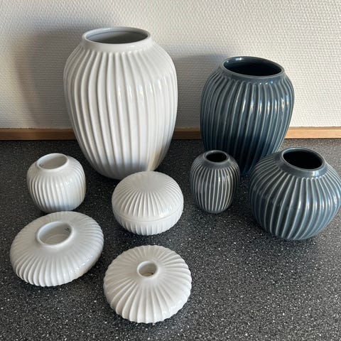 Kähler Hammershøi vaser og lysestage i lilla glas med rillet struktur. Sættet består af flere vaser i forskellige højder samt en lav lysestage til fyrfadslys. Velegnet som dekoration i stue, køkken eller entre, enten samlet som et sæt eller enkeltvis. Farven er en mørk lilla nuance med lyse lodrette striber, og materialet er glas med glansfuld overflade.