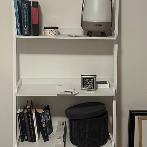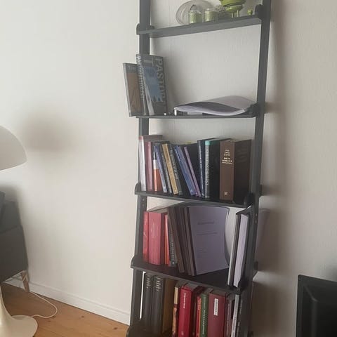 Reol i stigeform med flere åbne hylder. Reolen er smal og høj, velegnet til opbevaring af bøger, dekoration eller småting. Udført i sort materiale, egnet til placering op ad væg i stue, gang eller kontor.